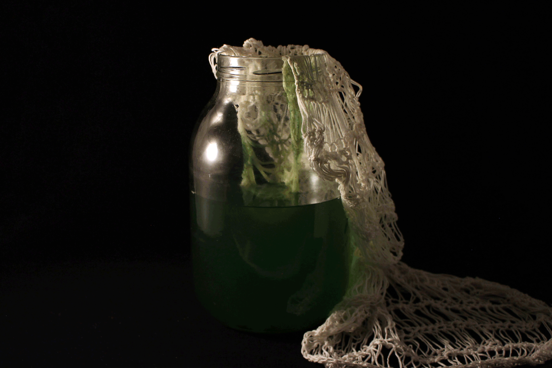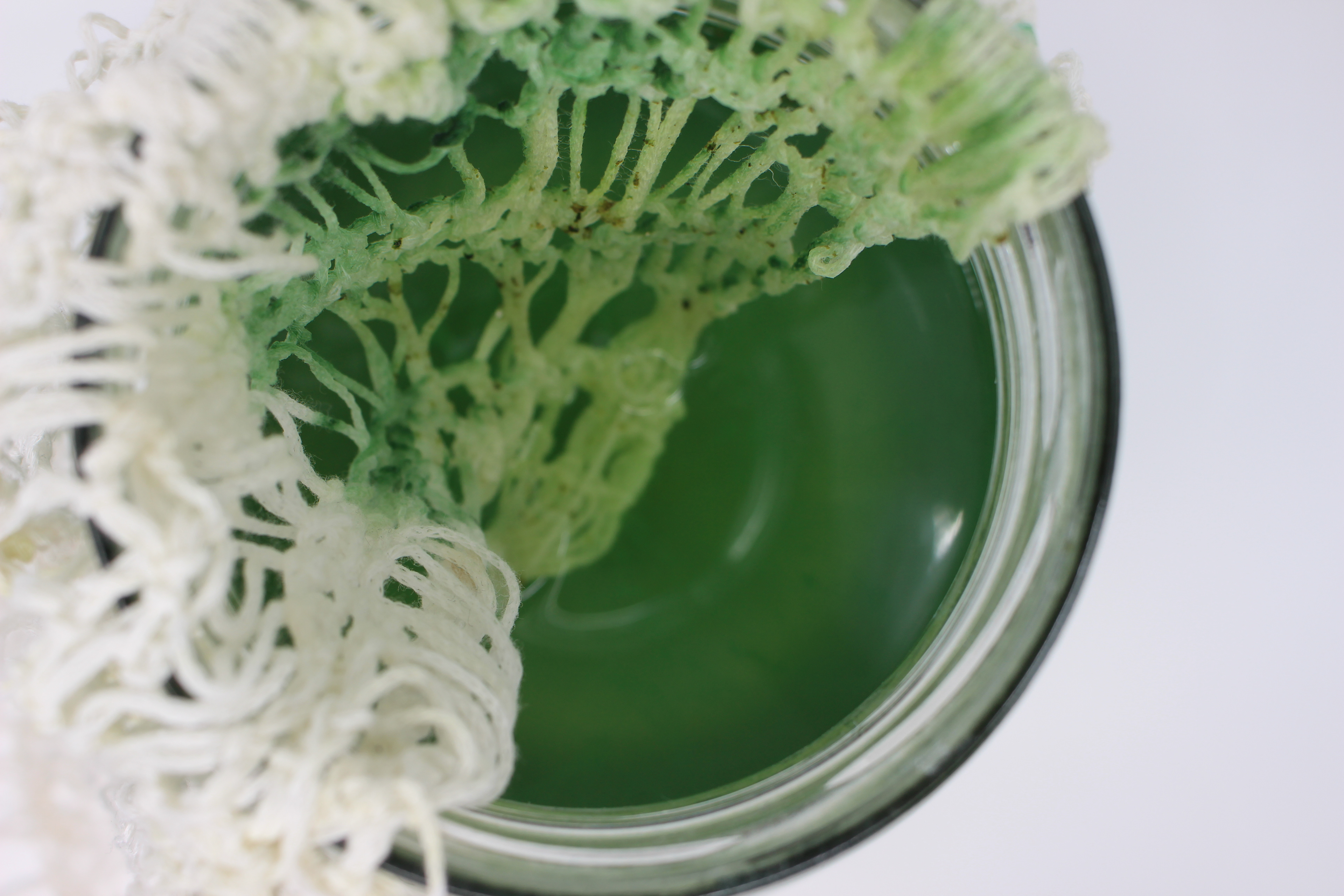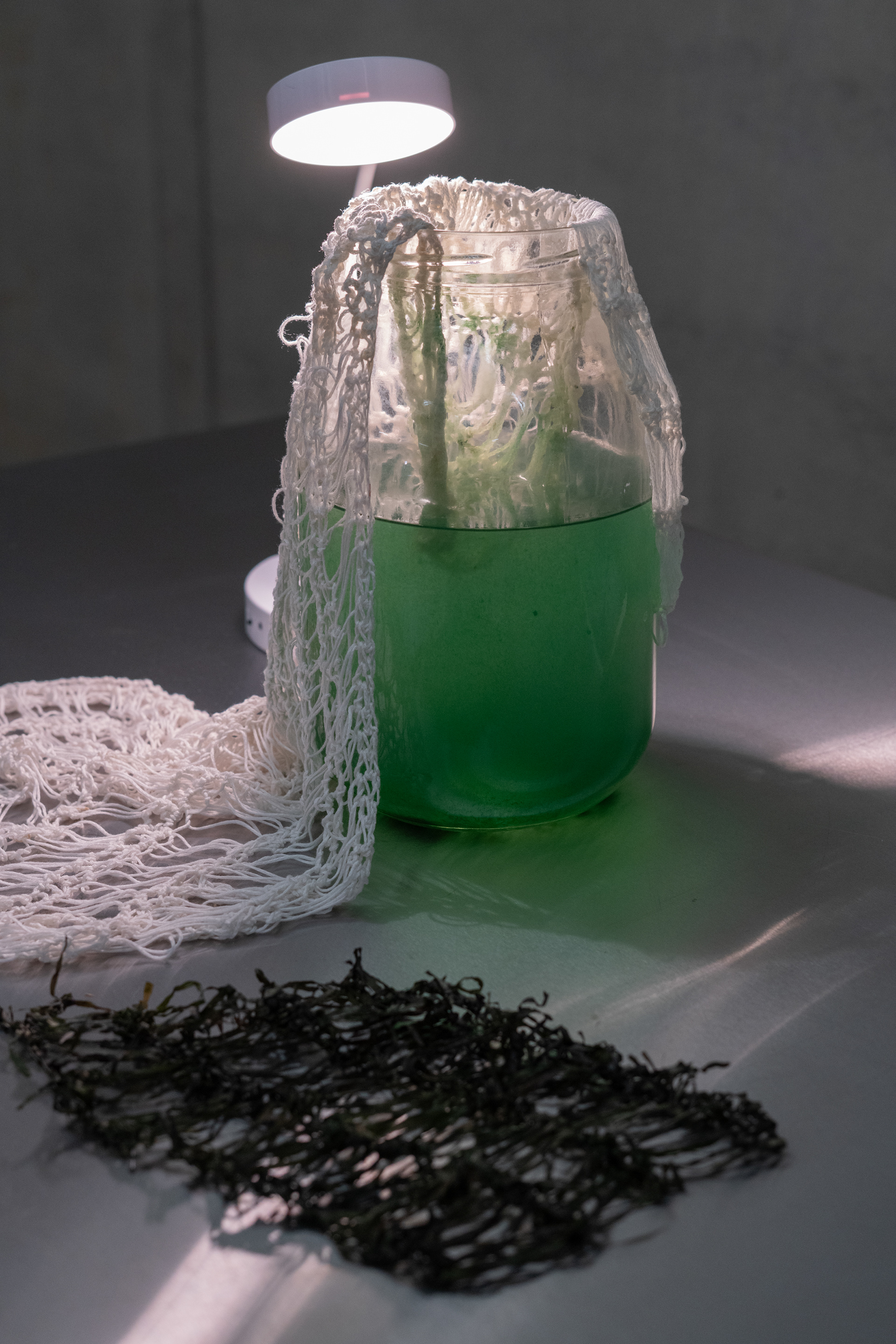 Materials: Crochet covering made with seaweed based yarn. Spirulina microbes growing within glass jar.