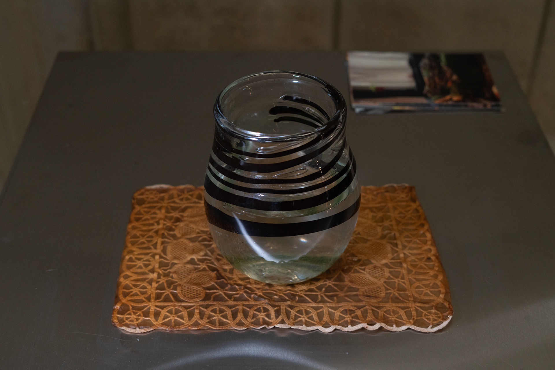 The glass vessel was blown with alternating translucent and darker bands that create zones of exposure and shade, allowing spirulina microbes to experience intervals of light and rest. This approach draws on practices common in DIY spirulina culturing, where light is manually modulated by masking parts of a jar or using timers to establish day–night cycles.